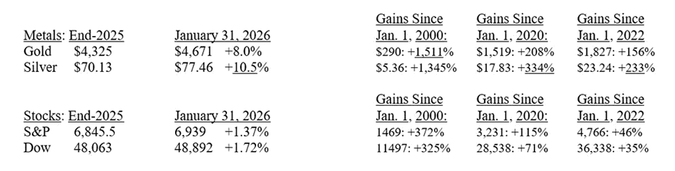 We know our history here. Just three months ago, something similar happened. From October 20 to 30, 2025, gold fell 10%, from $4,360 to $3,920 and silver declined more (-13%), falling from $53 to $46 in late October and from $78 to $70 after Christmas. We advised investors to “buy on dips,” and that was good advice, as gold and silver are still well above their October 30 lows of $3,920 and $46 per ounce.