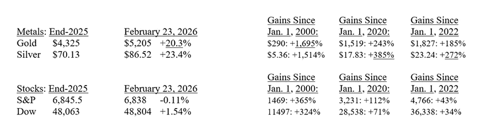 Gold and Silver are soaring once again. Despite a sharp correction in early February, both are up 20% or more so far in 2026, while some of the major stock market indexes fell below zero for 2026, year-to-date. The Dow remains up 1.5%, but the S&P is slightly down and the Nasdaq has lost 2.6% so far in 2026.